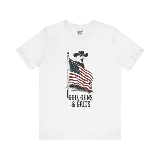 Patriotic Unisex Tee - "God, Guns & Grits" - Perfect for 4th of July and Outdoor Adventures